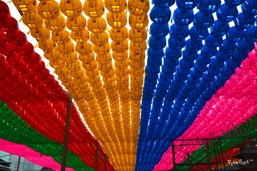분홍색 녹색 빨간색 노란색 파란 남색... 여러 색깔의 연등이 커다른 파도가 밀어치는 것처럼 온통 뒤덮고 있읍니다