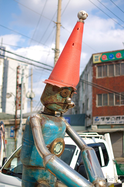 아마 이 근처 조형물중에 이 곳의 정체성을 가장 잘 표현한 작품 같아 보입니다. 오래된 철공소 골목의 과거와 앞날에 대한 고민을 한껏 하고 있는 듯 합니다. 그래도 앞으로의 미래는 이 인형의 손에 든 꽃처럼 밝고 예쁘겠죠