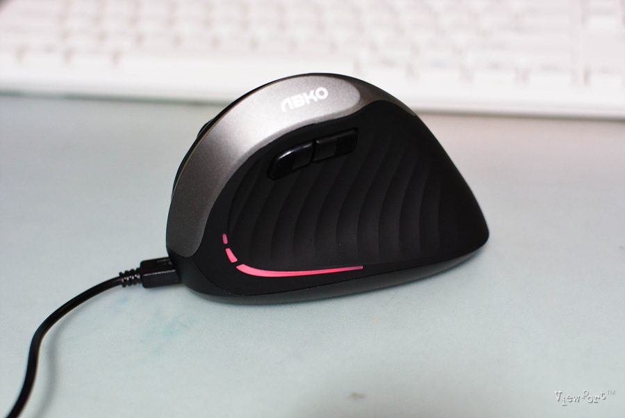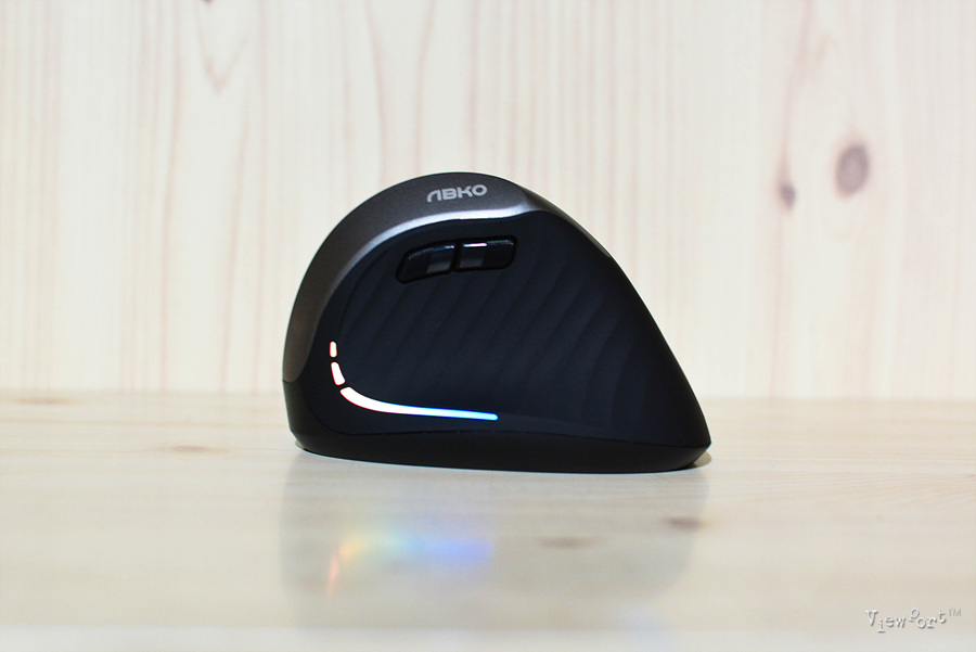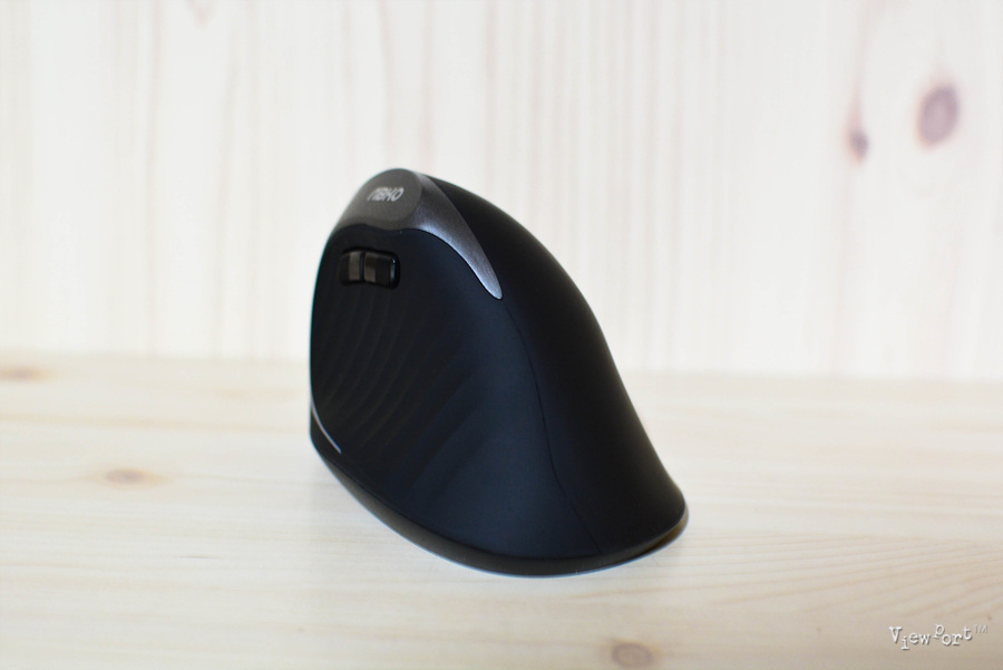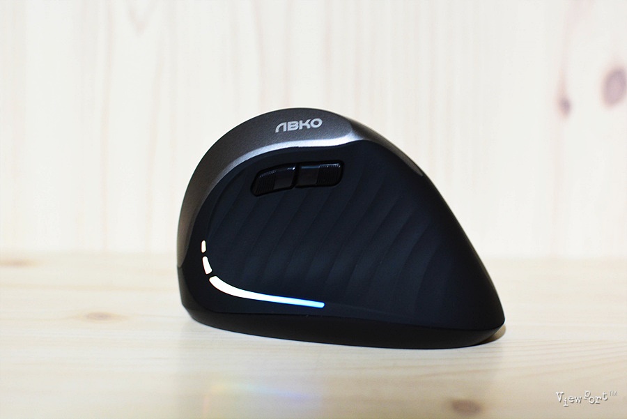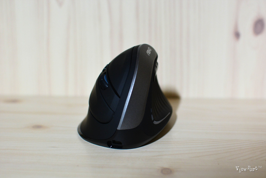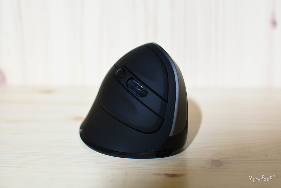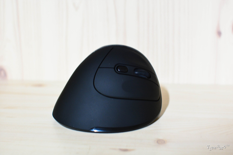 정면에서 본 모습인데 버티컬마우스라는 이름처럼 직각으로 서 있지는 않구요, 약간 기울어져 있어 손으로 잡는 그립감이 좋습니다