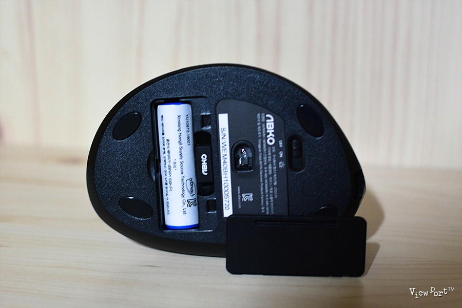 마우스 아래 부분을 보면, 맨 오른쪽에 마우스 전원 스위치가 있고, 하부를 열면 무선연결 리시버가 있습니다