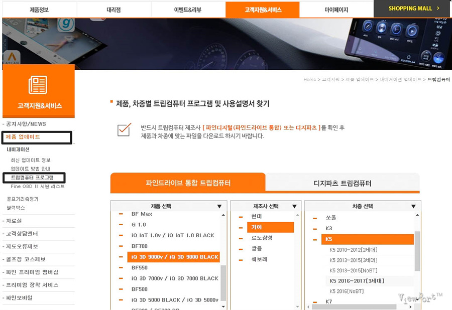 위 그림처럼 트립컴퓨터 프로그램에 들어가서 "네비 게이션 모델 선택 - 차량 제조사 - 차종과 연식을 선택하면,