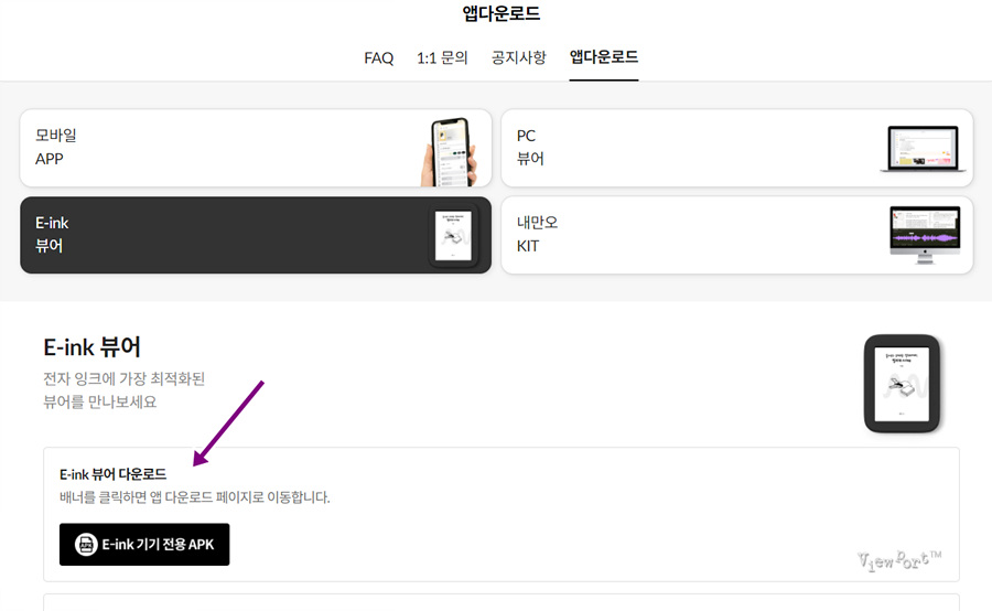 여기서 E-ink 뷰어 를 선택하고 들어가서, E-ink 뷰어 다운로드를 위한 APK 파일을 다운로드 받습니다