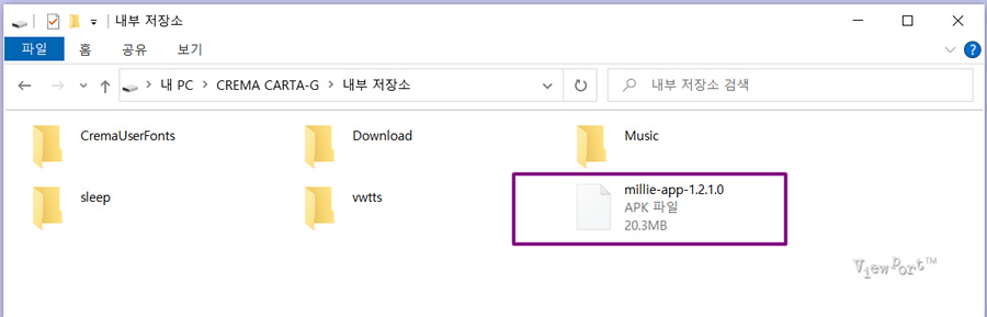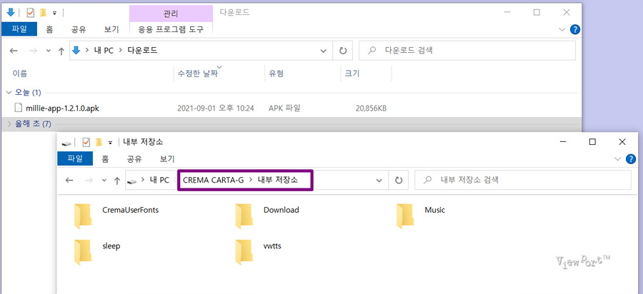 이제 노트북과 크레마를 케이블로 연결하고, 노트북에서 파일 탐색기를 열고 "CREMA CARTA-G > 내부저장소 " 에 다운로드 받은 APK 파일을 복사해 줍니다