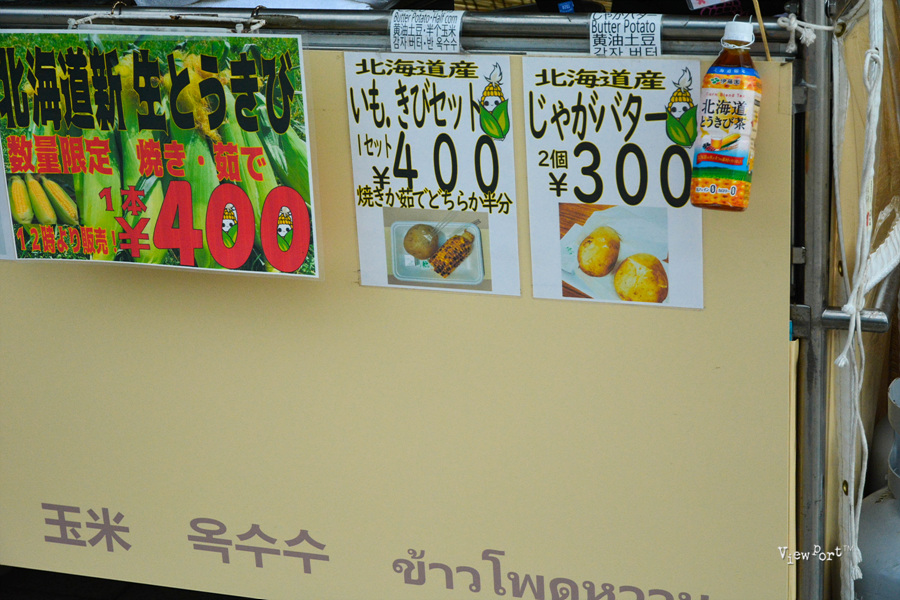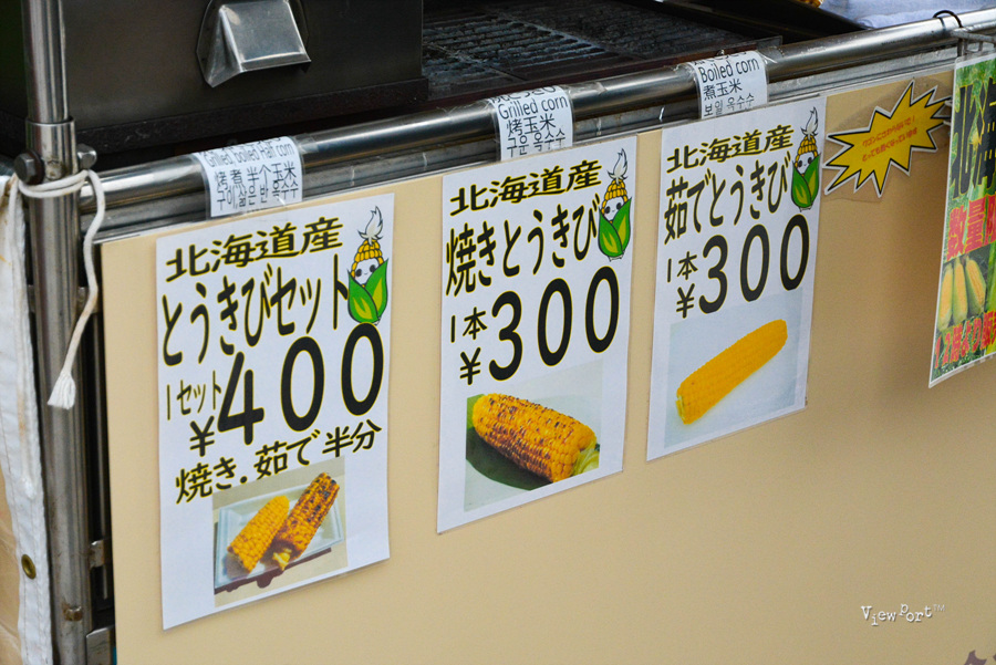 보니까, 구운옥수수나 삶은 옥수수 하나 300엔, 우리나라 짜장 짬뽕 반반처럼 삶은 옥수수 반, 구운 옥수수 반 400엔 이렇게 파는 것도 있었구요,