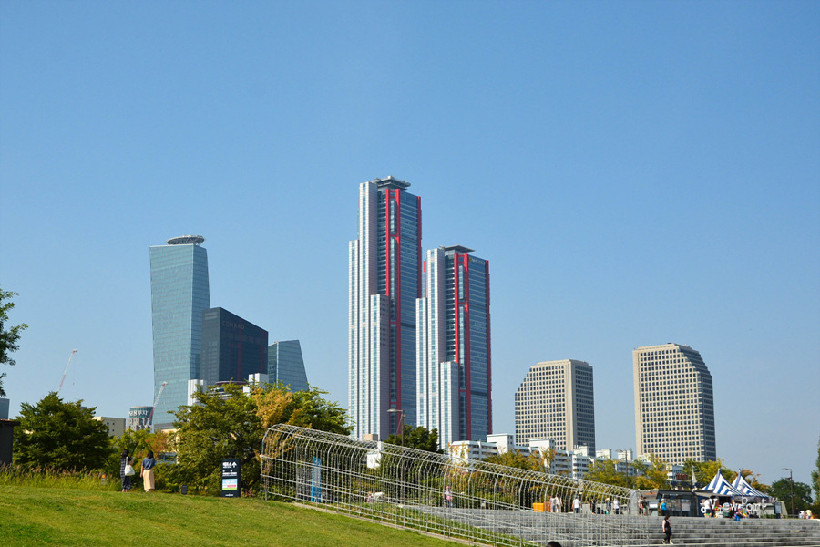 파란 가을 휴일의 서울 여의도 한강시민 공원 정경