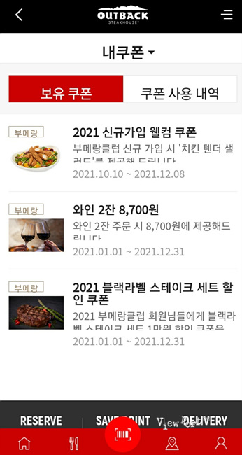 그리고, 아웃백 회원이나 신규 가입하면 몇가지 리워드와 쿠폰을 사용할 수 있습니다.