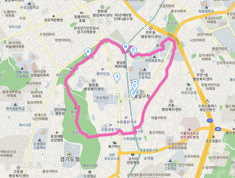 지도에서 처럼 수원 화성을 따라 성벽안으로 행리단길과 행궁동 벽화마을, 수원 통닭거리가 있읍니다. 수원화성이 결코 작은 성이 아니란 얘기죠.
