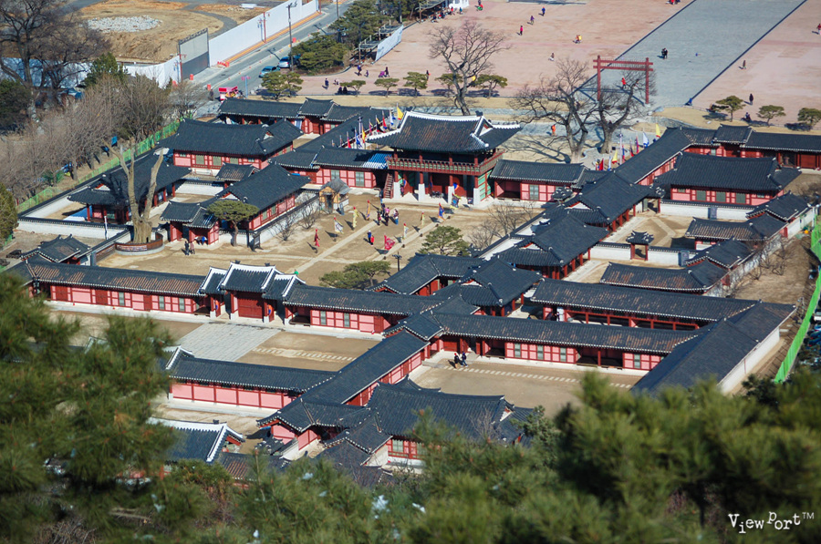 한참을 더 가다 보면 팔달산을 따라 산 언덕까지 성벽이 이어진 경사진 계단길이 계속 이어집니다. 힘들지만 쭉 따라가다 보면, 화성행궁이 내려다 보이는 서장대입니다.