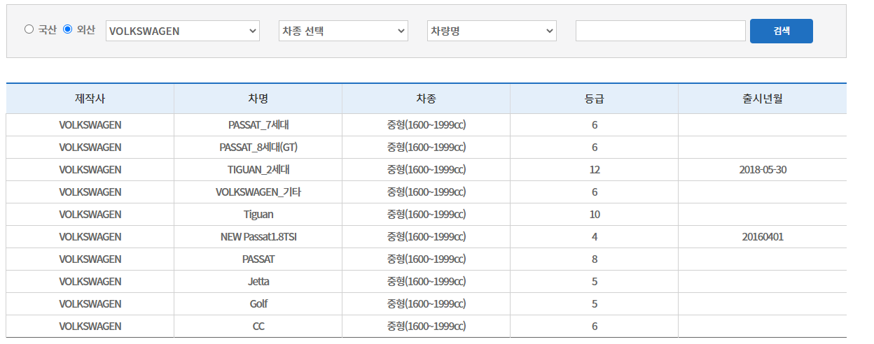 한동안 국내 수입차량의 많은 비율을 점유했지만 디젤 게이트로 몸살을 앓았던 폭스바겐도 생각보다 등급 점수가 높지 않습니다. 골프와 파사트가 등급 점수가 너무 낮게 나와서 놀랐구요, 티구안이 그나마 12등급 정도가 나왔군요.