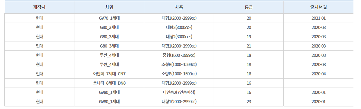먼저 현대차인데요, 대략적인 지수는 15~ 20등급내외 수준이고 제네시스 시리즈는 20등급정도 수준입니다.