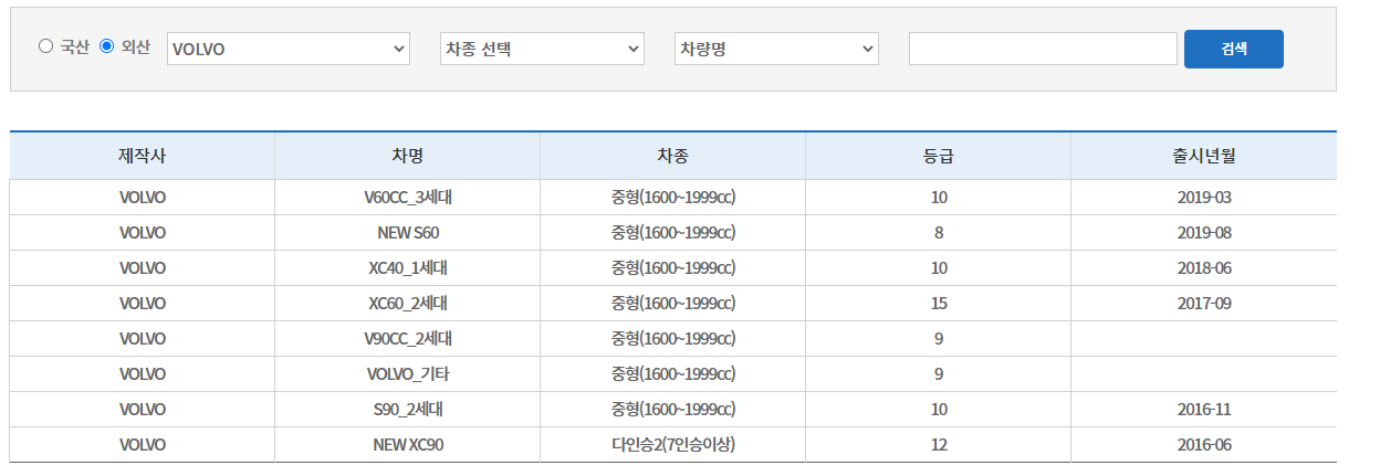 최근들어 안전의 대명사와 토르의 망치 디자인으로 많이 팔리고 있는 볼보도 9~15등급 수준인데, 여기도 세단보다 SUV 모델의 등급 점수가 상대적으로 높습니다.