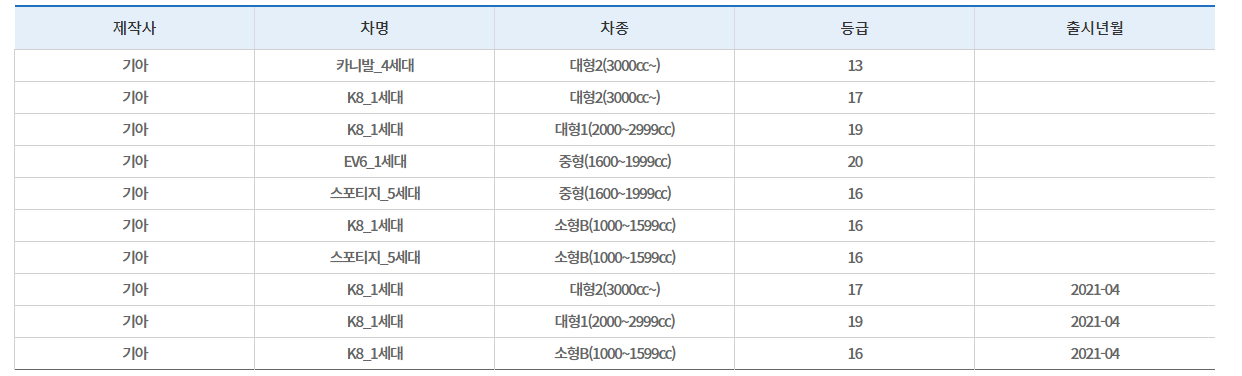 기아차도 역시 등급 점수가 좋은 편인데, 16~20등급 수준이고, 현대차에 비해 등급 점수가 좀 낮은 것 같네요, K8 같은 신규 모델의 등급을 참고 하시면 될 것 같아요