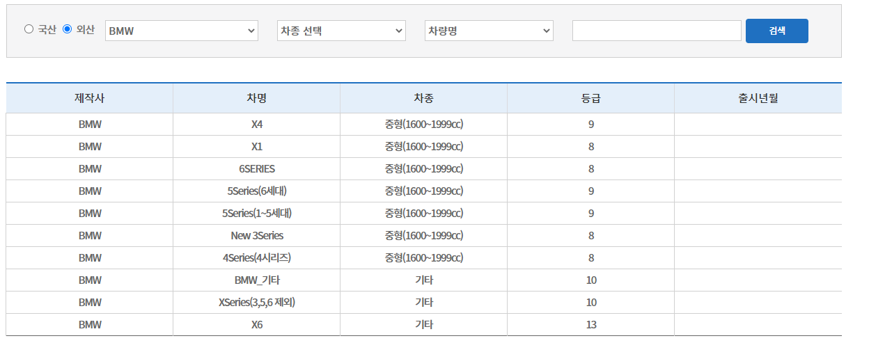 아무래도 수입차는 공임비용이나 부품값이 비싸니까 상대적으로 국산차에 비해 등급이 낮을 것 으로 예상되는데요,
