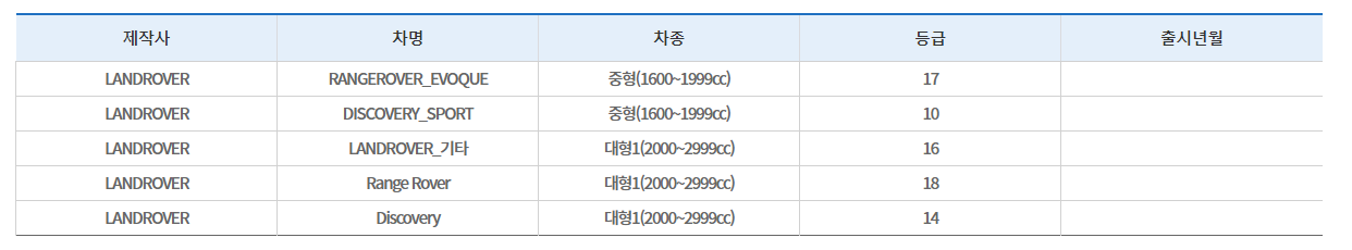 랜드로버의 등급점수가 상대적으로 높은데, 보험개발원 평가 등급을 보면 전체적으로 SUV 차량에 대한 등급 점수가 높네요 (그래도 F-Pace 점수는 좀...)