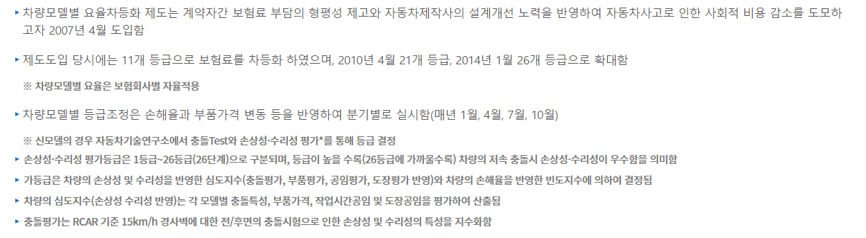 | 차량모델별 요율차등화 제도는 계약자간 보험료 부담의 형평성 제고와 자동차제작사의 설계개선 노력을 반영하여 자동차사고로 인한 사회적 비용 감소를 도모하고자 2007년 4월 도입함 제도도입 당시에는 11개 등급으로 보험료를 차등화 하였으며, 2010년 4월 21개 등급, 2014년 1월 26개 등급으로 확대함※ 차량모델별 요율은 보험회사별 자율적용
