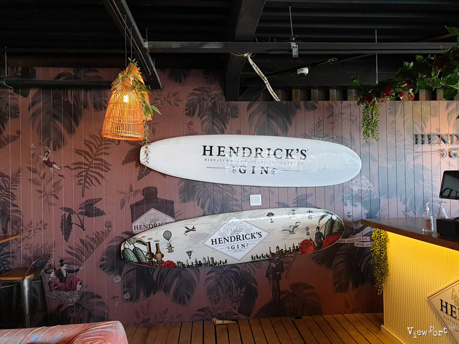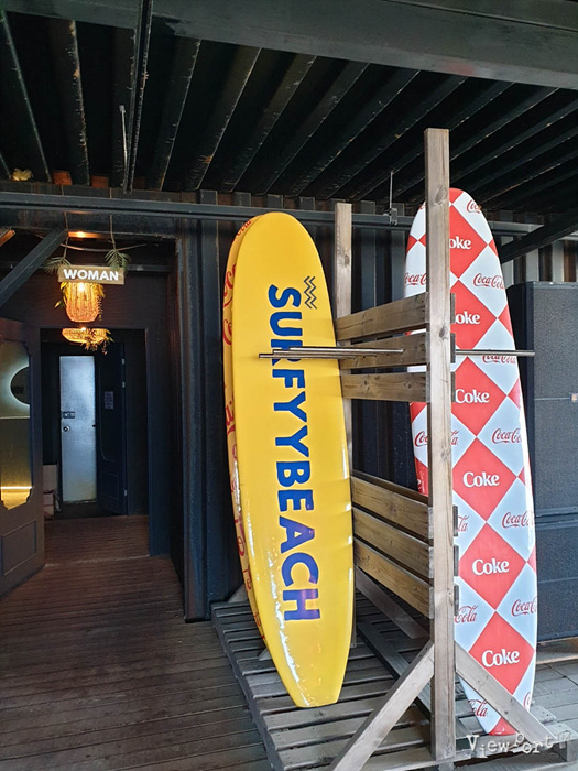 건물안쪽으로 들어가 보면, 이렇게 써피비치를 상징하는 예쁜 써핑보드가 장식된 바와 카페가 있어요. 여기도 사진 찍기 좋은 배경이죠.
