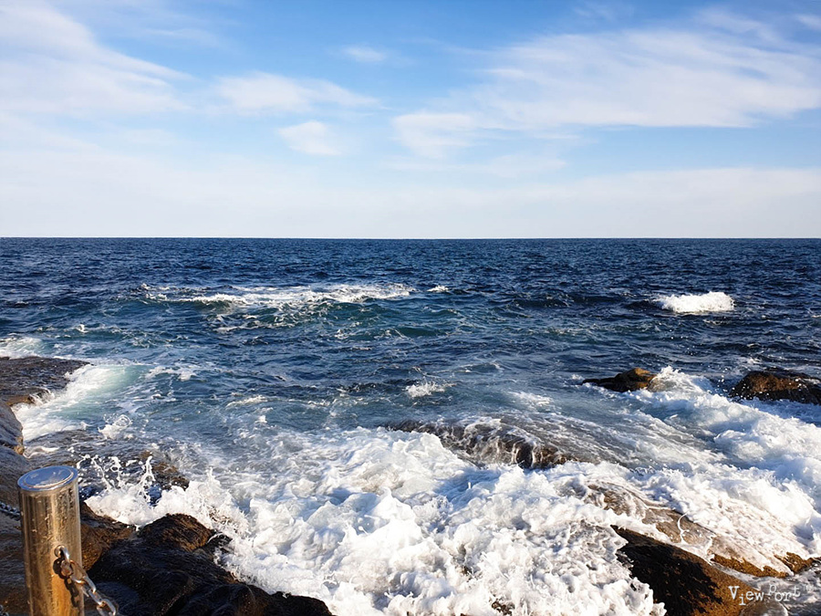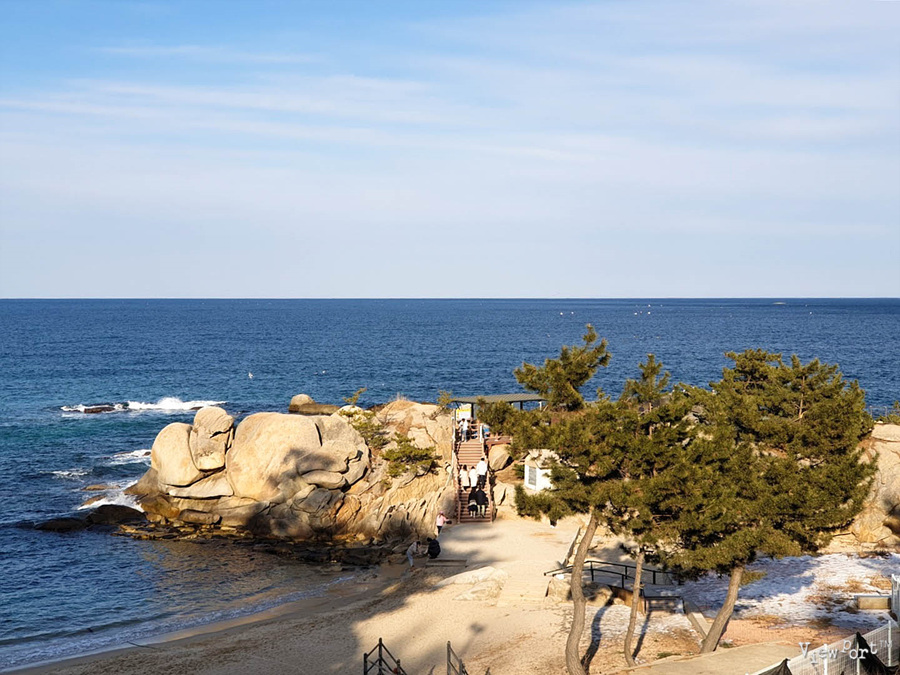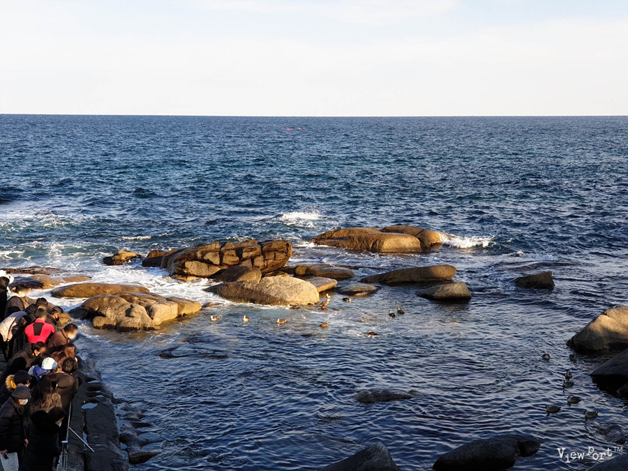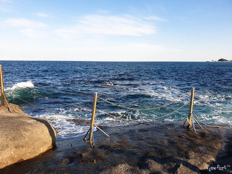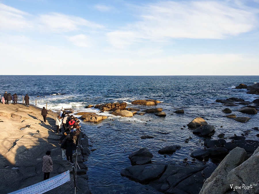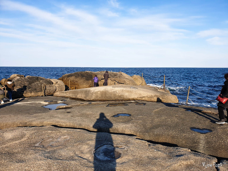 바다쪽으로 넓고 평평하게 퍼져있는 바위와 안전철선앞에 사람들이 모여 있는게 보이는데요,