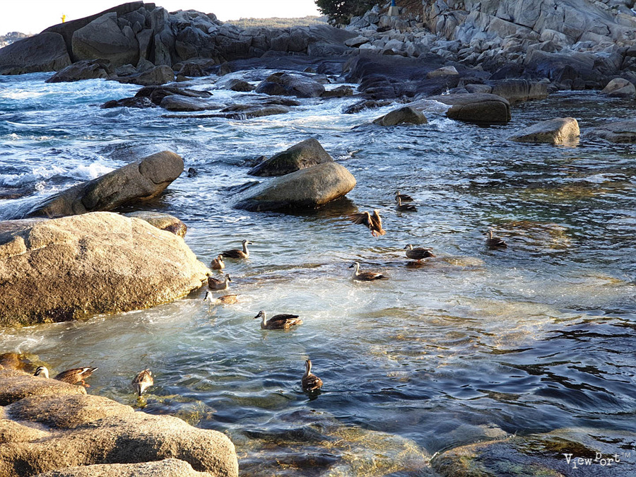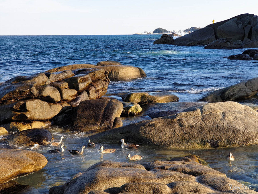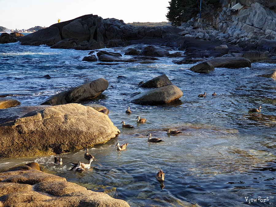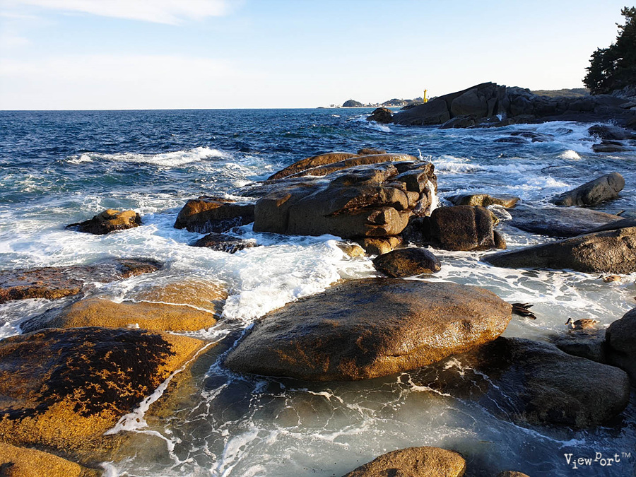 바닷가에 내려서면 마치 피어있는 연꽃을 닮은 너럭바위가 있고, 그 바위에 올라서면 그리고 연신 거칠게 몰아치는 하얀 물보라가 금방이라도 바위를 집어 삼킬듯 밀려들고, 건너편에는 황어와 청동오리가 유유자적 지내는 광경이 모두 한곳에서 벌어집니다