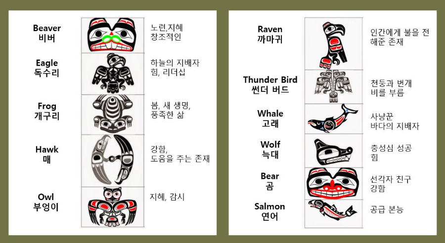 각 동물들이 가지고 있는 의미들입니다. 우리가 보기는 힘들지만, 태평양 연안에서는 자주 보이는 고래 (범고래)나 연어,상상의 동물인 썬더버드등도 있고, 봄에 제일먼저 튀어 나온다는 개구리는 봄과 새생명을 의미한다는게 우리의 경칩과 같은 의미네요
