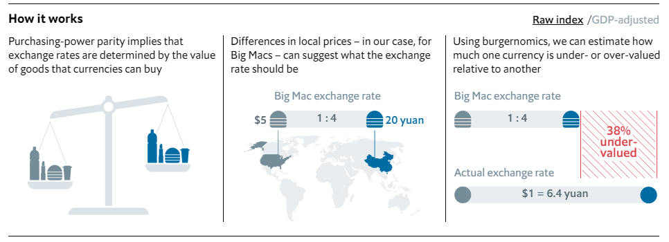 이런 지표 개발을 위해선 동일한 상품과 서비스의 가격 비교가 필요한데, 비교적 세계 여러나라에 점포를 갖고 있는 맥도널드의 대표 메뉴인 빅맥의 가격 비교를 통해 환율로 설명되지 못하는 각국의 구매력 수준을 설명하고자 하는 아이디어에서 만들어진 지표랍니다.