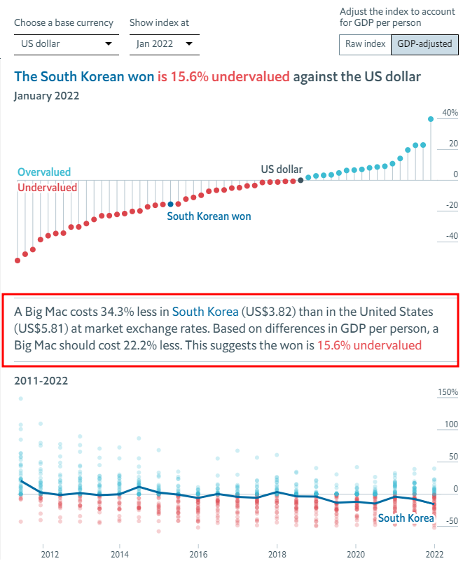 그런데 또 하나 재미있는 지표가 있습니다. 단순 빅맥가격을 반영한 통화간 비교가 아니라 여기에 국내총생산 GDP 를 반영해서 통화 비교를 한 지표가 있습니다