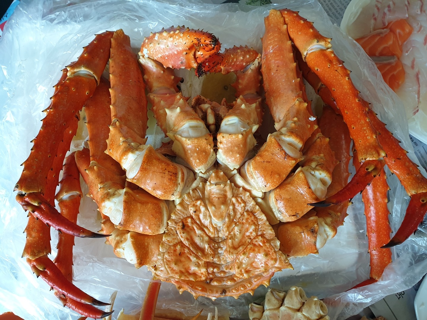 몇 군데 돌아다니다가 그전에 거래한 적이 있는 가게에서 사장님과 가격을 맞춰 킹크랩 한 마리를 샀습니다.
