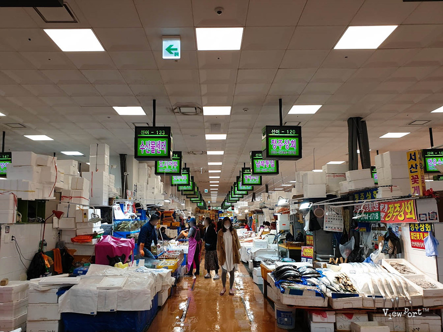 수산시장안으로 들어가면 이렇게 간판 색깔로 구역을 나누어 두었습니다. 파란색은 냉동수산물, 선어는 녹색, 회를 뜨는 활어는 파란색입니다.
