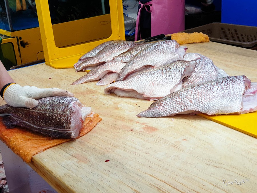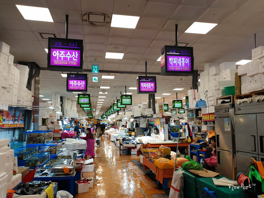 수산시장 간판 색깔이 녹색이면 선어를 파는 구역, 보라색은 냉동수산물을 파는 구역이구요, 회와 같은 활어는 파란색 구역에서 살 수 있습니다