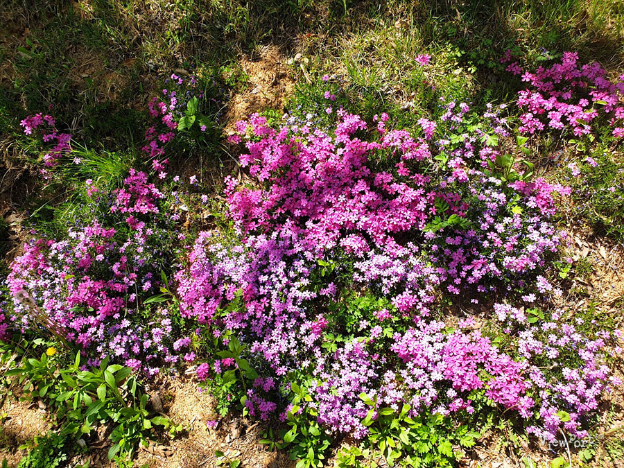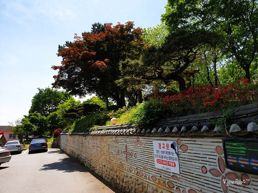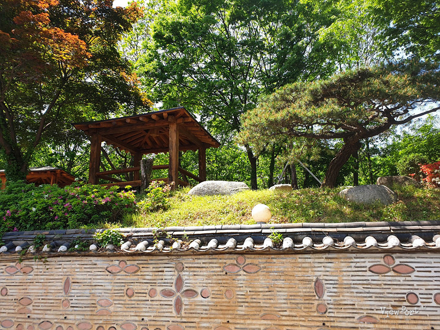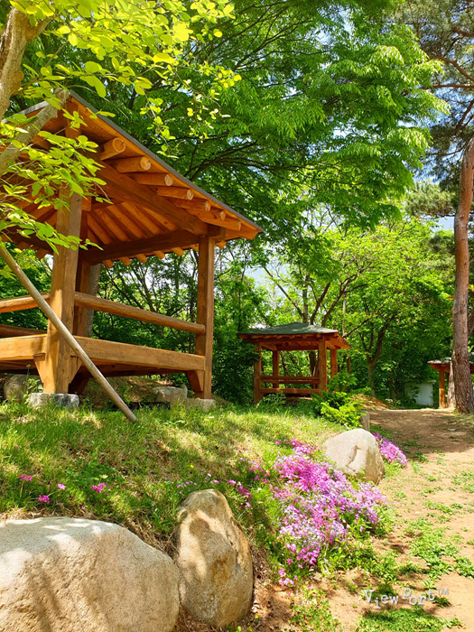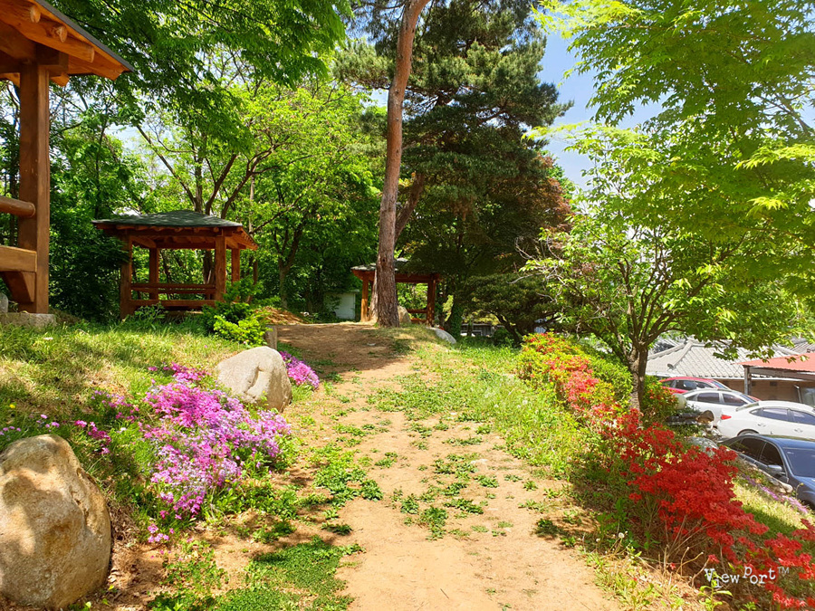 주차장 오른쪽 담 뒤로 조그만 동산에 정자와 꽃들이 예쁘게 피었습니다