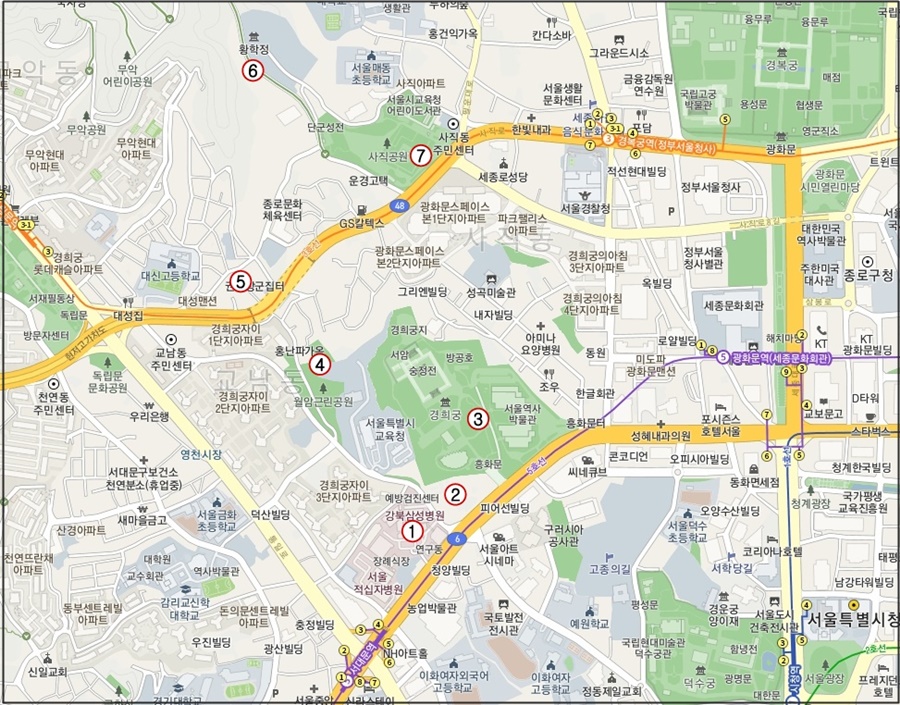 | 1.경교장 2.돈의문 박물관마을 3.경희궁 서울역사박물관 4.홍난파가옥 5. 딜쿠샤 6.황학정 7.사직단 |