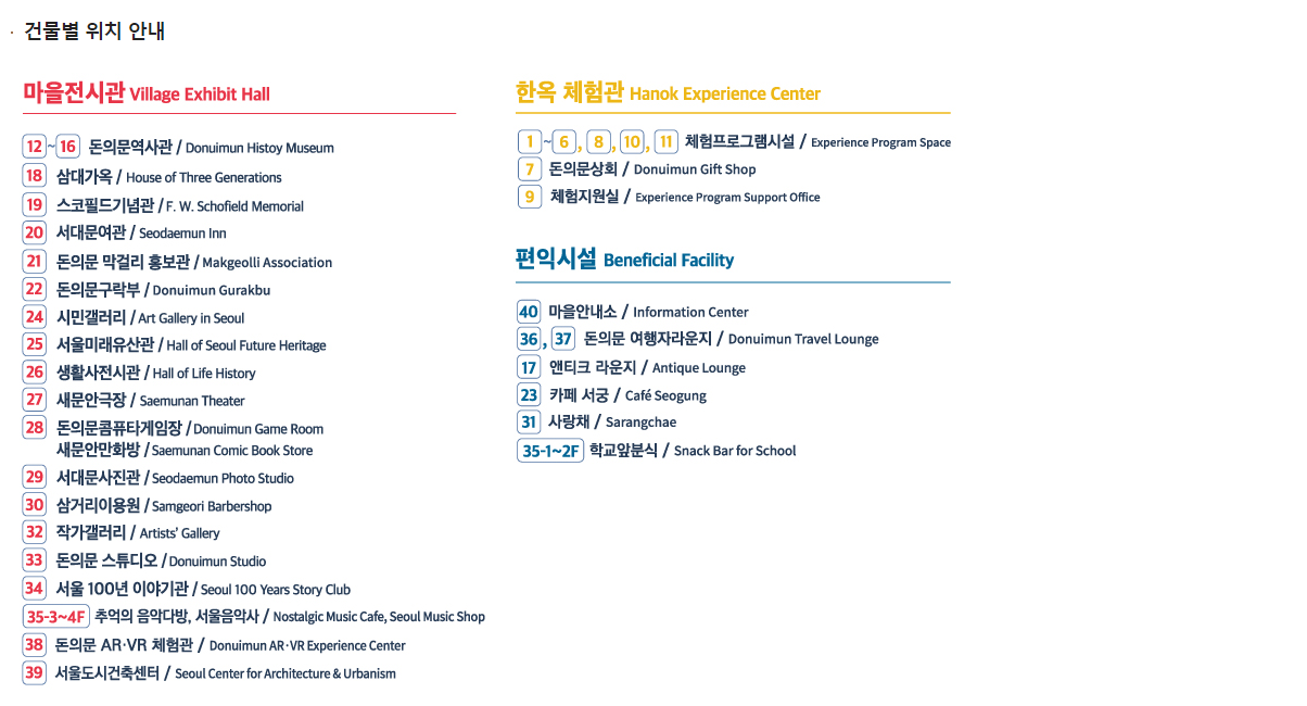 약도에서 40번이 마을 안내소이구요, 1~11번 까지가 한옥 체험 시설입니다.