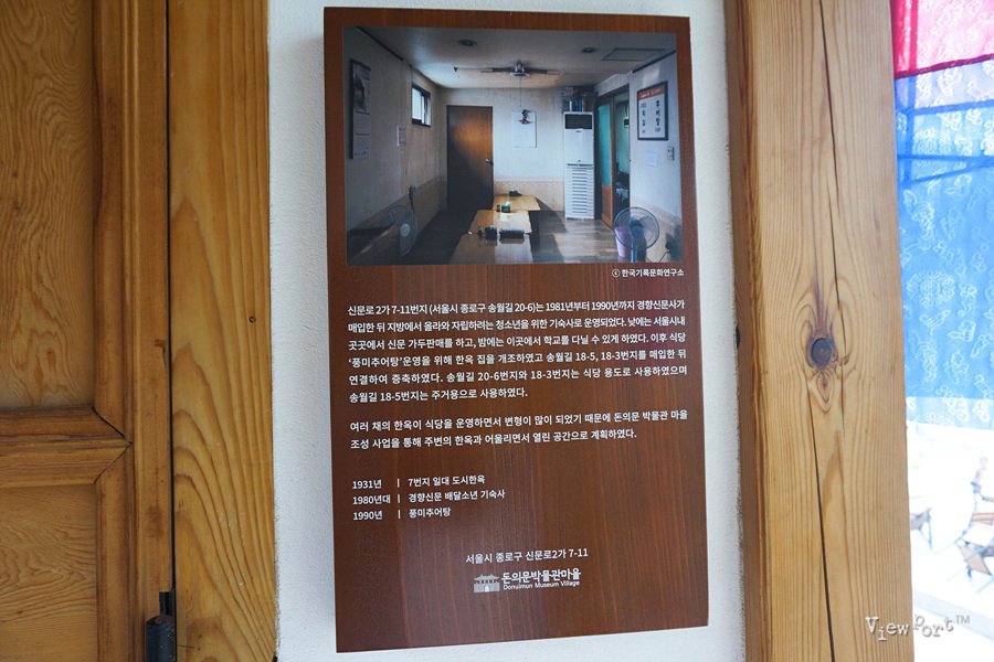 이 인근은 1931년 도시 한옥기역이었고, 한때는 경향신문사가 매입한뒤 신문 배달소년이나 자립 청소년을 위한 기숙사로도 활용 되었었네요. 그 뒤로는 풍미 추어탕이라는 음식점이 들어서면서 다시 한옥을 재조하였고 돈의문 박물관 마을조성 사업을 진행 하면서 열린 공간으로 다시 태어났습니다