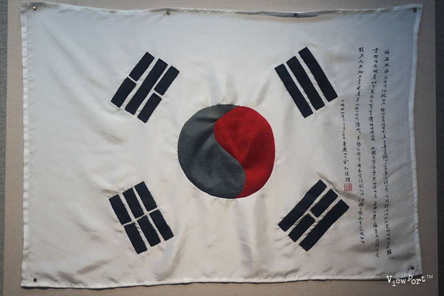 그리고 그 옆의 태극기는 김구선생이 중국에서 미국으로 가는 매우사신부에게 준 태극기로, 광복군에 대한 우리 동포들의 지원을 당부한 선생의 친필 글씨가 적혀 있읍니다