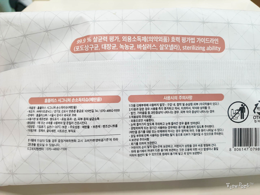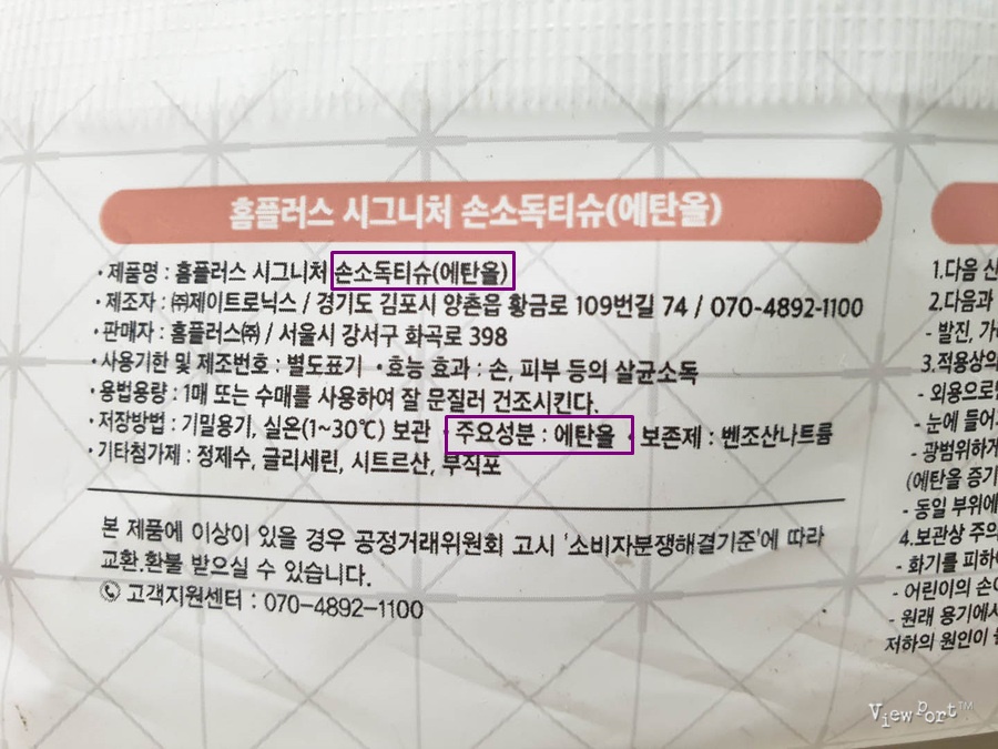 집 근처 홈플러스익스프레스에서 사 온 손소독티슈인데요, 여기 뒷면에 손소독티슈의 성분을 보면 그 이유를 알 수 있습니다