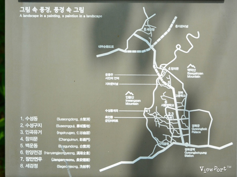 윤동주 시인의 시비가 있는 왼편에는 겸재 정선이 그린 그림속 백악산에서 내려다 본 서울의 모습을 그린 장안연우 라는 그림이 소개되어 있습니다. 이 일대는 겸재 정선이 그린 산수화속에 담긴 곳이 많아 곳곳에 작품속 장소를 소개하는 안내가 많이 있습니다