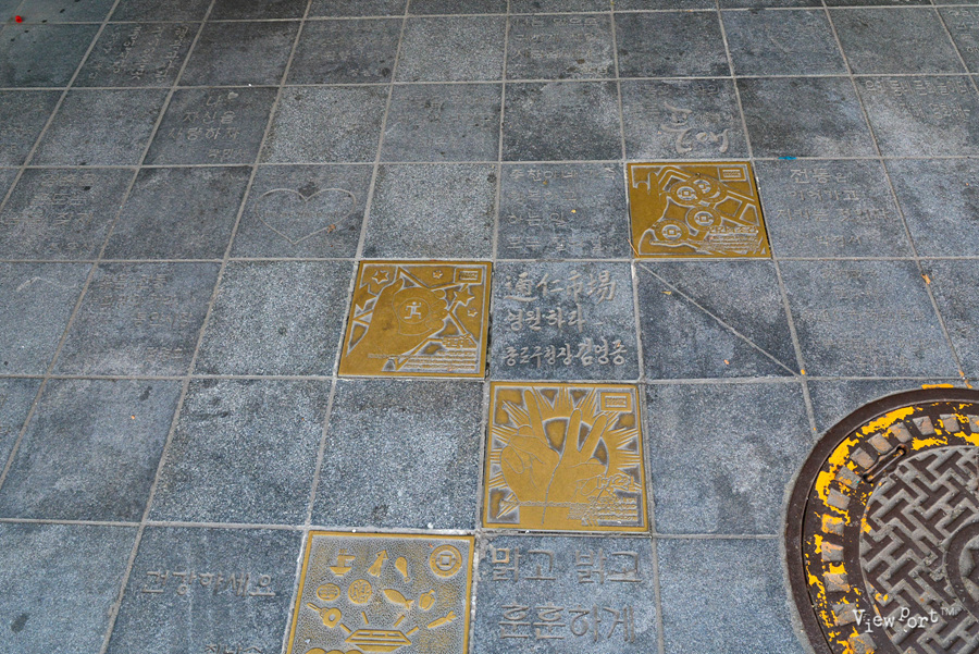 시장 건너편으로 나오면 바닥에 여러가지 이야기가 담긴 타일도 있는데요, 통인 시장은 특히 코로나로 인해 도시락을 판매하지 못하면서 젊은 사람들의 발걸음이 더 뜸해 진 것 같습니다