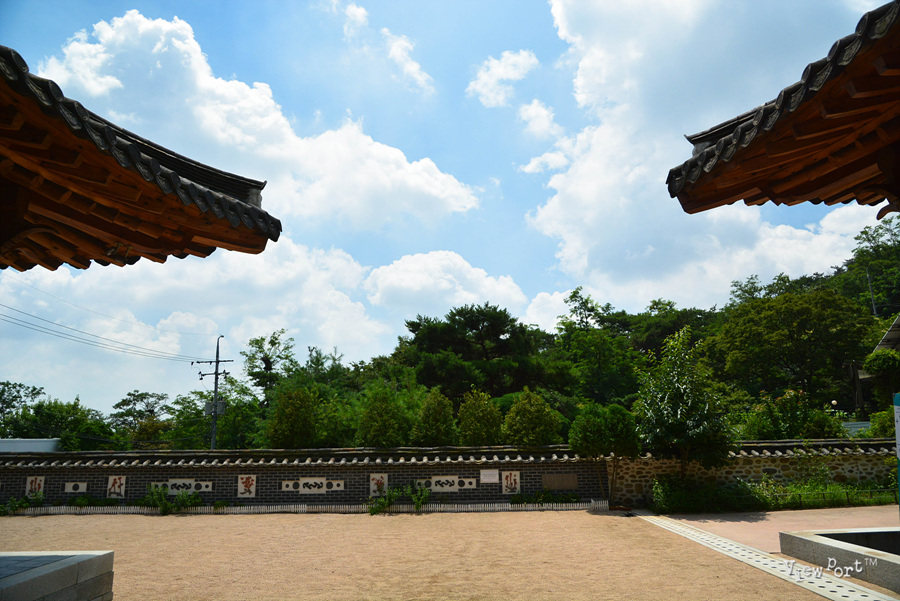 예쁜 문양이 새겨진 기와 담 너머로 파란 나무들과 하얀 구름이 가득한 여름 하늘이 예쁜 오후예요