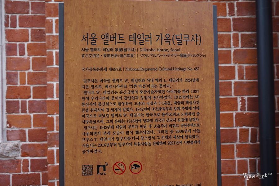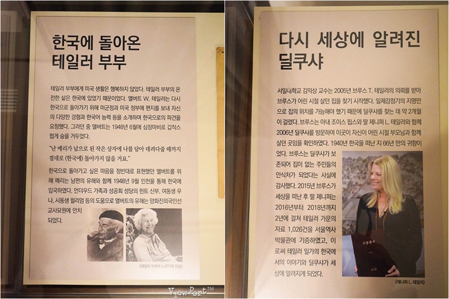 조금 낯선 단어인 딜쿠샤는 페르시아어로 "기쁜마음" 이란 뜻의 단어입니다. 이곳은 원래 앨버트 테일러와 메리 테일러 부부가 1924년부터 살던 집입니다. 당시 광산 기술자였던 아버지를 따라 조선에 왔던 미국인 사업가 앨버트 테일러와 동양의 여러나라를 순회하며 연극을 하던 영국인 배우 메리가 만나 인도에서 결혼후 1917년부터 한국에 살게 되었죠.