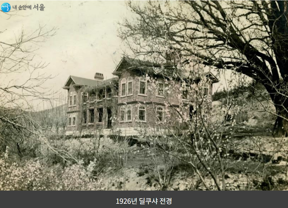 테일러부부가 한국에서 먼저 살던집은 서대문인근의 작은 회색집이었어요. 이후 테일러부부가 한양 도성 성곽을 따라 산책하다가 은행나무가 있는 넓은 땅을 발견하고 후에 여기에 집을 짓게 된 게 바로 딜쿠샤입니다.