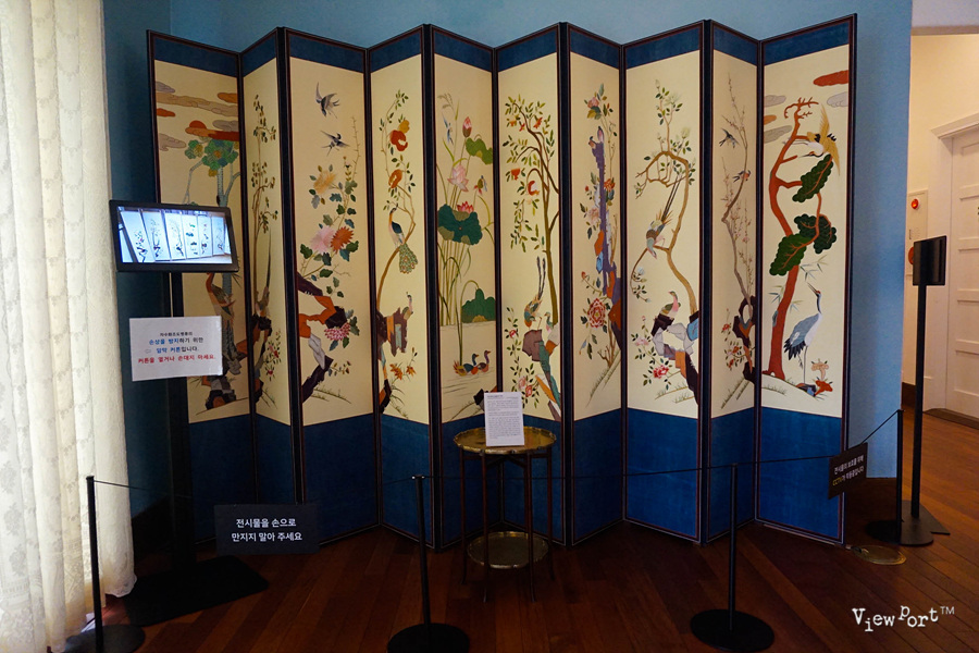 특히 자수 화조도 병풍을 접거나 펴거나 위치를 바꿈으로 방 전체의 공간의 크기를 조절하는 방식으로 사용했다는 기록이 있는데, 당시 궁에서 병풍을 사용하던 방식이라고 합니다