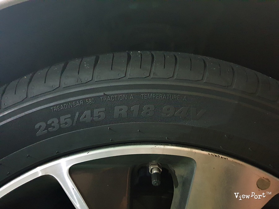 그 다음 타이어의 크기를 확인해 볼 수 있는 데요, 적힌 숫자가 타이어의 폭 / 편평비 / 타이어 직경 / 하중지수 / 속도지수 입니다.