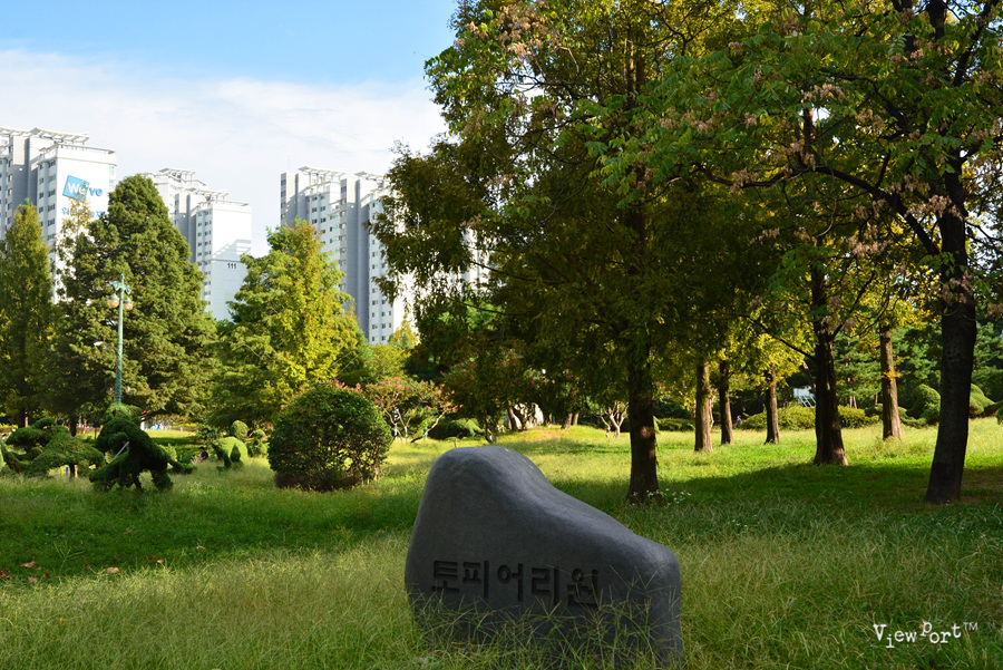 그 중에 나무 숲 사이로 특이하게 생긴 동물모양의 나무들이 보이고, 그 앞쪽에는 토피어리원이라는 표지석이 있습니다