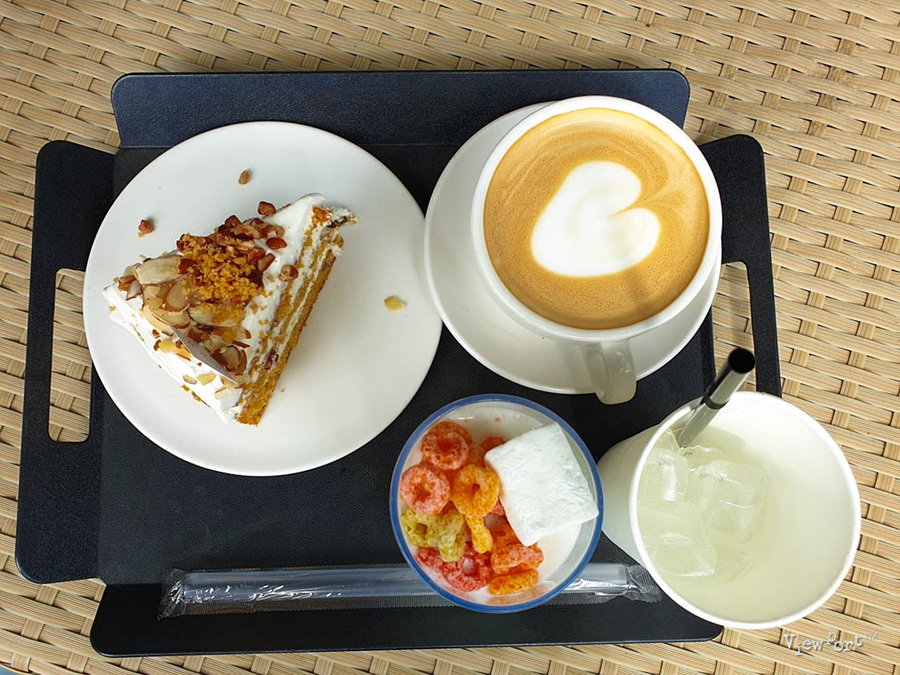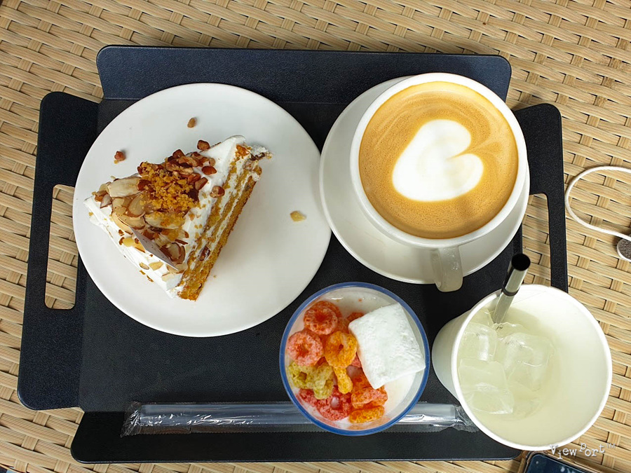주문한 조각케이크와 커피, 가운데 조그만게 소진담라떼