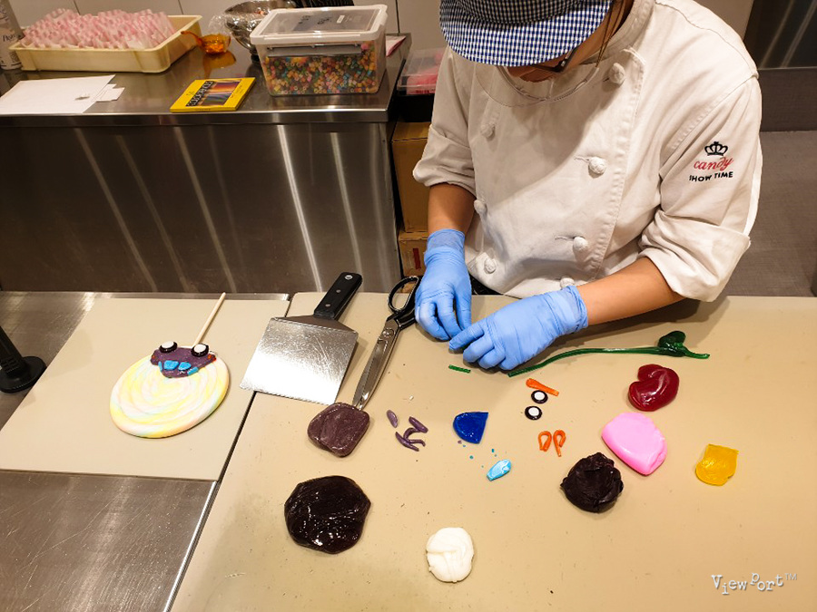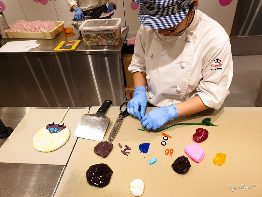 이렇게 직접 만드는 모습을 볼 수 있는데, 여러 모양을 얇게 뽑아서 김밥 말듯이 말아서, 똑똑 작은 크기로 끊어 내면 아래 와 같은 캔디가 만들어 집니다