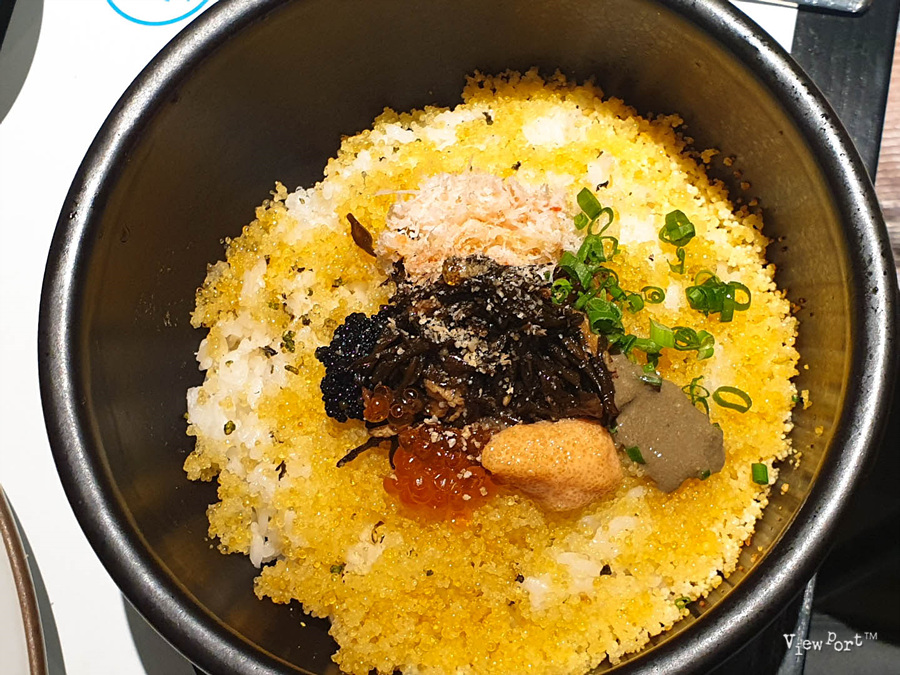 오복 게살날치알밥은 날치 알밥에 게살과 성게알들이 올라 있습니다