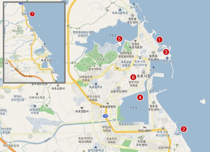 1. 속초등대해수욕장 - 하마식당 2. 속초해수욕장 - 속초아이 3. 영 금 정 4. 청 초 호 5. 영 랑 호 6. 속초 관광 수산 시장 7. 고성 아야진해수욕장 : 강원 고성군 토성면 아야진리 |