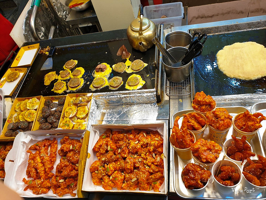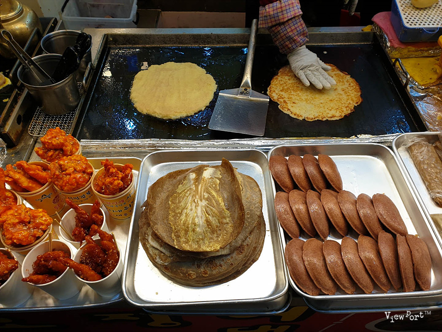 컵으로 파는 닭강정들도 있구요, 메밀전도 맛있게 지글지글 구워지고 있어요