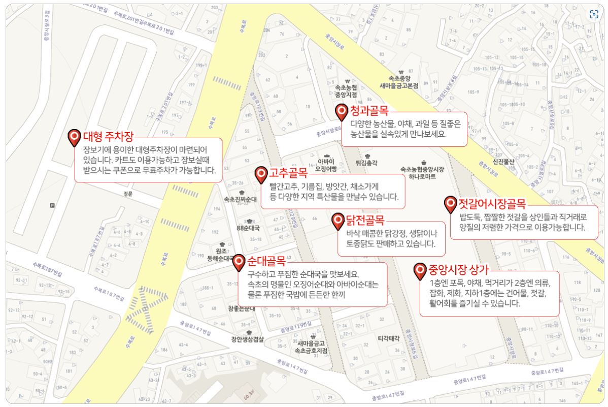 주 소 : 강원 속초시 중앙동 471-4 운영시간: 08:00 ~ 21:00 주차 : 시장에서 1만원 이상 구입시 지급하는 주차권을 이용(1매당 30분 사용 최대2매 가능) |