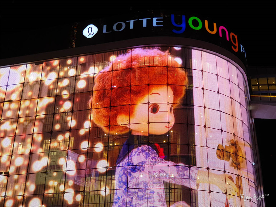 롯데 영플라자의 파사드는 똔뚜라는 귀여운 요정과 크리스마스를 즐기는 꼬마 아이의 스토리를 영상으로 표현한 것이어서, 스토리를 생각하면서 보면 작은 미소를 머물게 되요