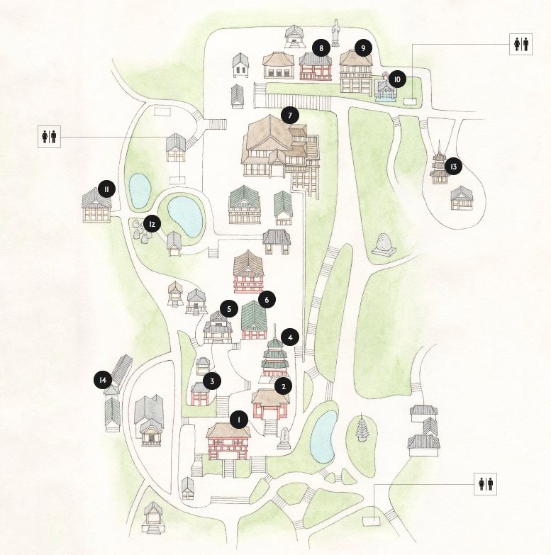 | 1. 니오몬 仁王門(인왕문) 2. 시몬 西門(서문) 3. 종루 4. 삼층탑 三重塔 5. 즈이구도 随求堂 (수구당) 6. 교도経堂(경당) 7. 본당 8. 아미타당 9. 오쿠노인 奥の院 10. 오토와노타키 音羽の瀧 11. 세이쥬인 (성취원) 12. 천석불 13. 고야스노토 子安塔(자안탑) 14. 대강당 |